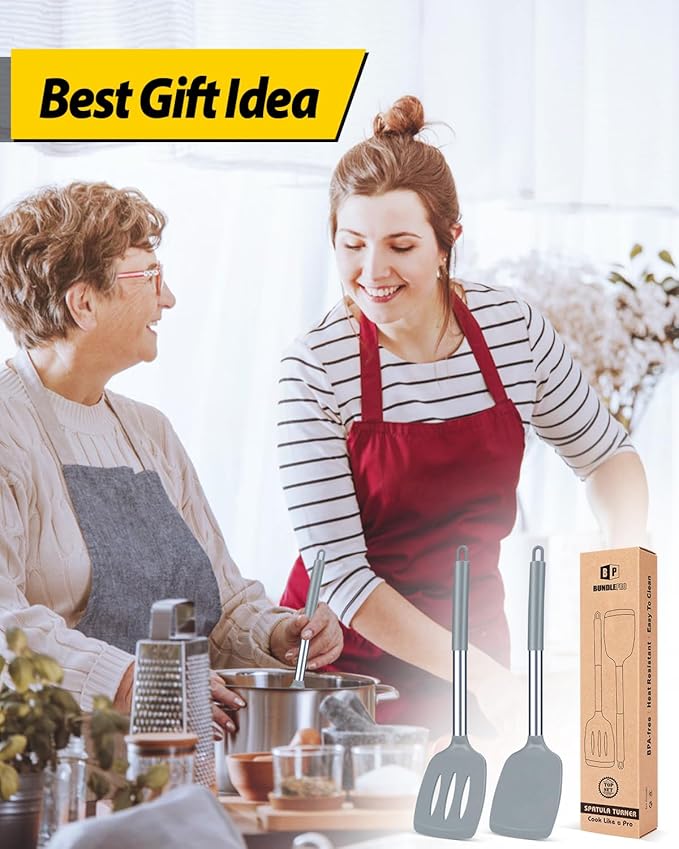 Pack of 2 Silicone Solid Turner, Non Stick Slotted Kitchen Spatulas, High Heat Resistant BPA Free Cooking Utensils, Ideal Cookware for Fish, Eggs, Pancakes(Gray)