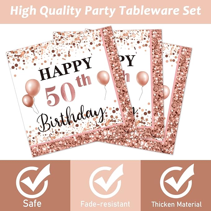 - 【High-Quality】50 and Fabulous Party tableware are made from food-grade cardboard, thickened and sturdy, can hold up well with any kinds of food. The napkins are soft and non-smell. The birthday supplies are designed in a rose and gold background, make the whole supplies set looks more elegant.