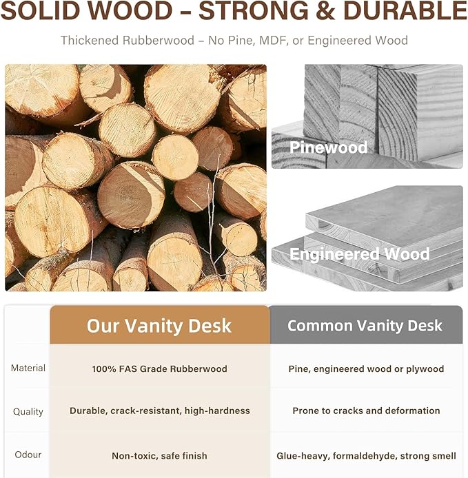 - 【Premium Solid Wood Build】Made from 100% FAS-grade rubberwood, this vanity table offers lasting stability. Thick legs ensure durability, and any mild initial scent naturally fades within 24–48 hours