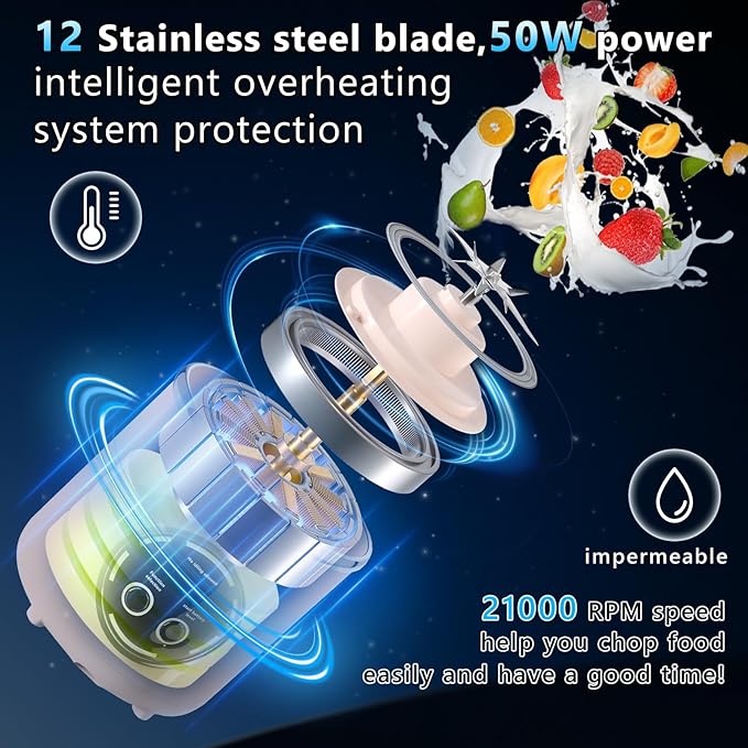 - Versatility: This 700ml mini mixer is equipped with 12 sharp stainless steel blades with a speed of 21000 revolutions per minute, which can quickly chop fruit (watermelon, mango, kiwi, strawberry) and vegetables and prepare nutritious milkshakes and smoothies in Within 10-15 seconds;Comes with a special travel lid, can interchange with the cutter base and work as a drinking bottle